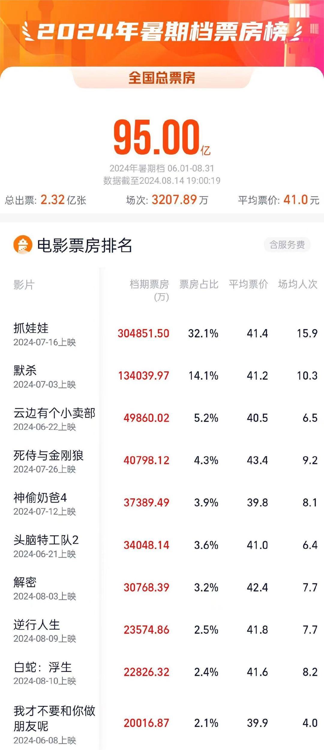 据网络平台实时数据,截至8月14日19时,2024年暑期档(6月—8月)档期总票房(含预售)突破95亿! 详情>>
