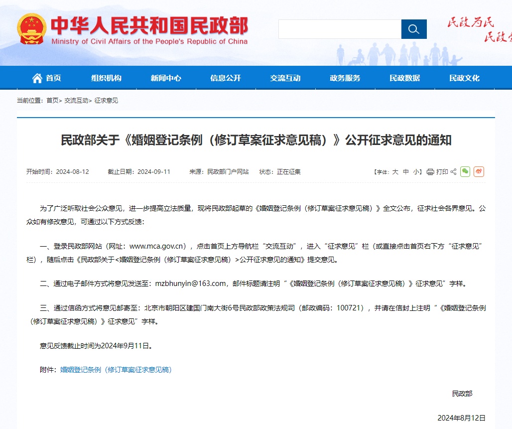 《婚姻登记条例(修订草案征求意见稿)》
