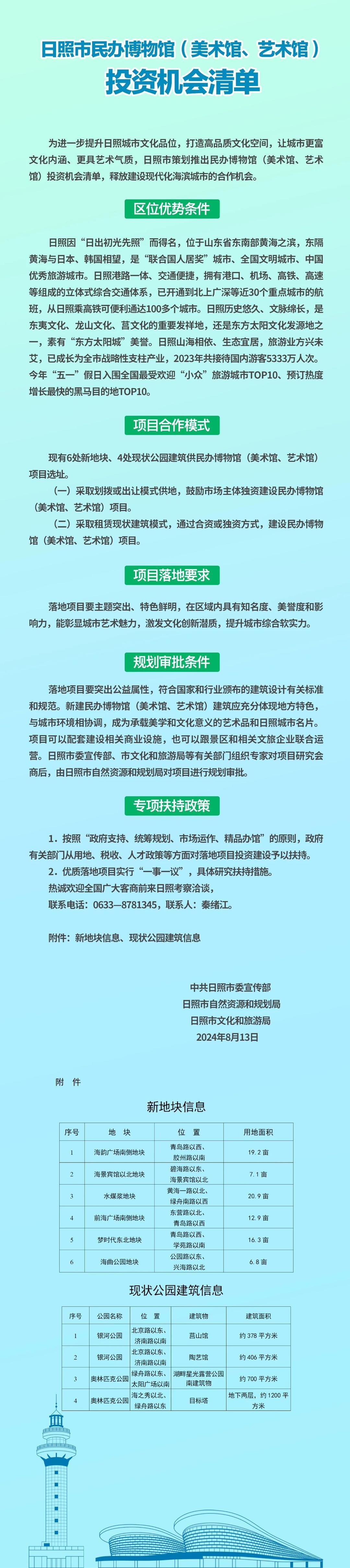 记者8月14日从日照市文化和旅游局获悉,为进一步提升日照城市文化品位,打造高品质文化空间,让城市更富文化内涵、更具艺术气质,日照市策划推出民办博物馆(美术馆、艺术馆)投资机会清单,释放建设现代化海滨城市的合作机会。以下为投资机会清单具体内容: