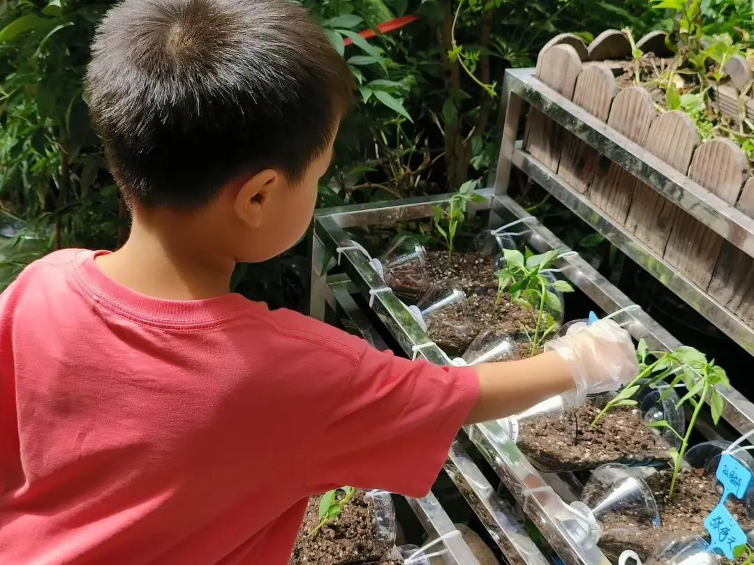 接着,孩子们亲手将番茄和辣椒的幼苗小心翼翼地植入花盆的肥沃土壤中,期待着它们茁壮成长,结出丰硕的果实。