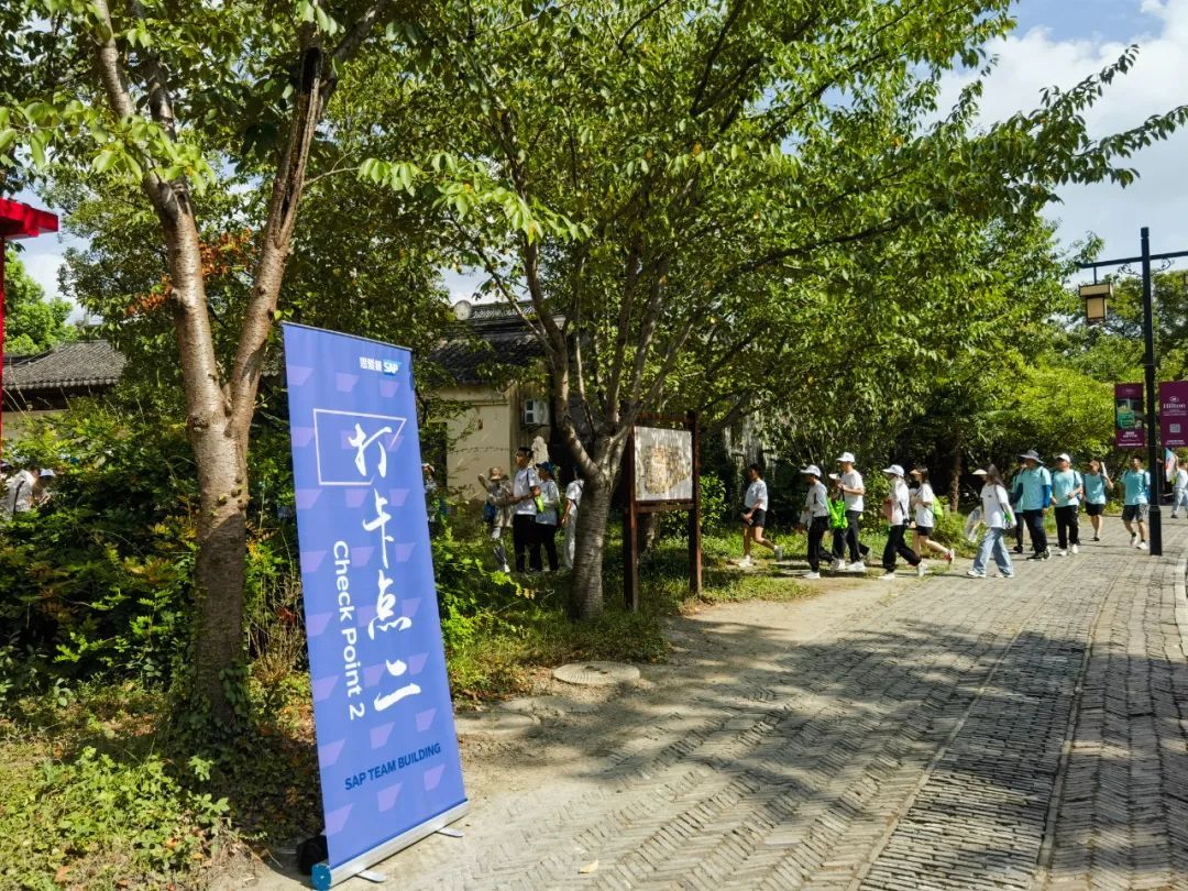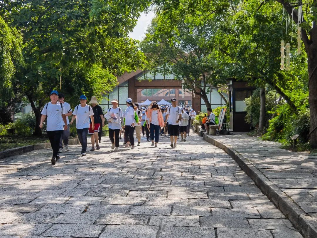 上午9点,穿着蓝、白、绿三种不同颜色参赛服的参与者汇聚在广富林文化遗址三厅广场。随着一声哨响,健步走大军全员出动,通过抽题、答题和盖章的方式,在沿途的3处点位依次打卡并领取印章。