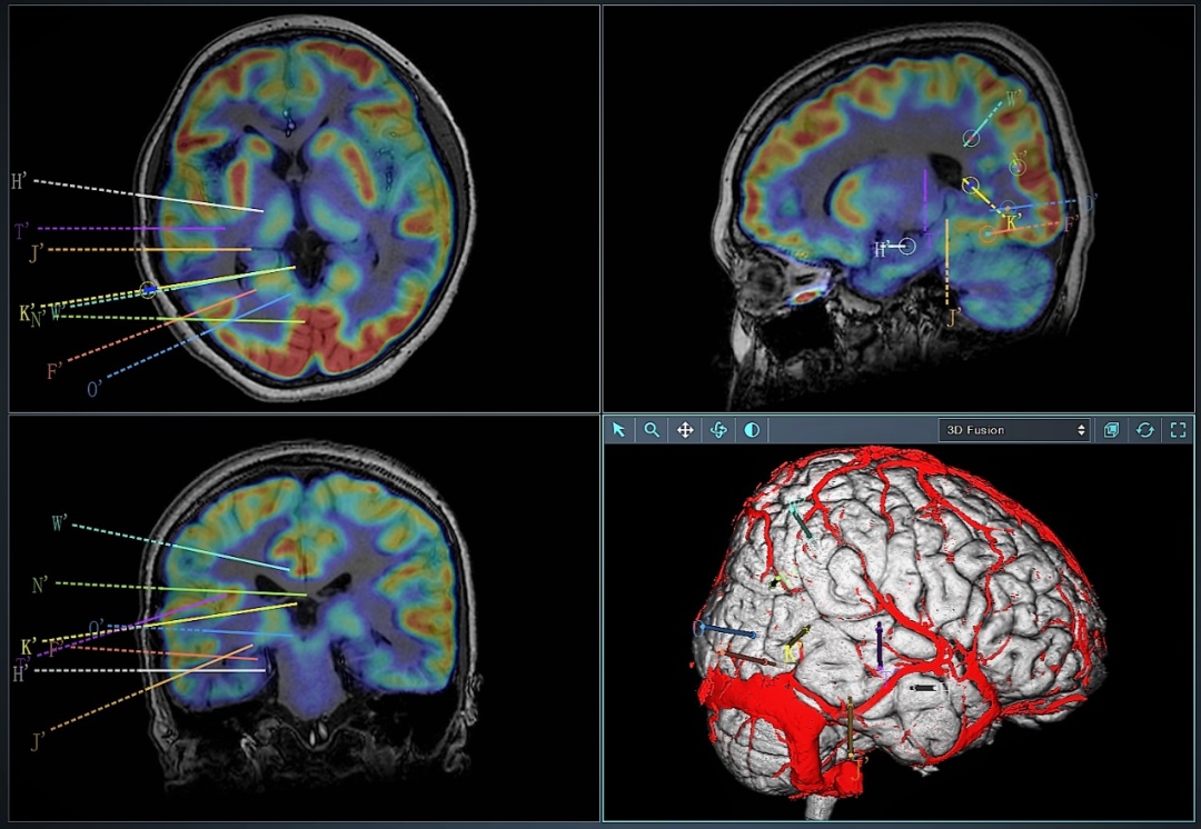 住院后,癫痫中心难治性癫痫多学科团队经过高清长程视频脑电图持续监测,结合影像学资料进行多模态融合后处理,怀疑其右侧顶叶局部大脑皮层发育不良是导致其反复癫痫发作的罪魁祸首。由于致痫灶边界不清,且毗邻大脑功能区,神经外科赵瑞主任设计颅内深部电极植入方案,利用手术机器人将直径仅0.8mm的深部电极精准植入致痫区,经立体定向脑电图(SEEG)监测证实其右侧顶叶局部皮层正是其癫痫发作的起源,进一步通过SEEG引导下的射频热凝术微创毁损致痫区,射频热凝术后芳芳的癫痫发作完全缓解,目前已术后8月未见癫痫复发,取得了良好的治疗效果。