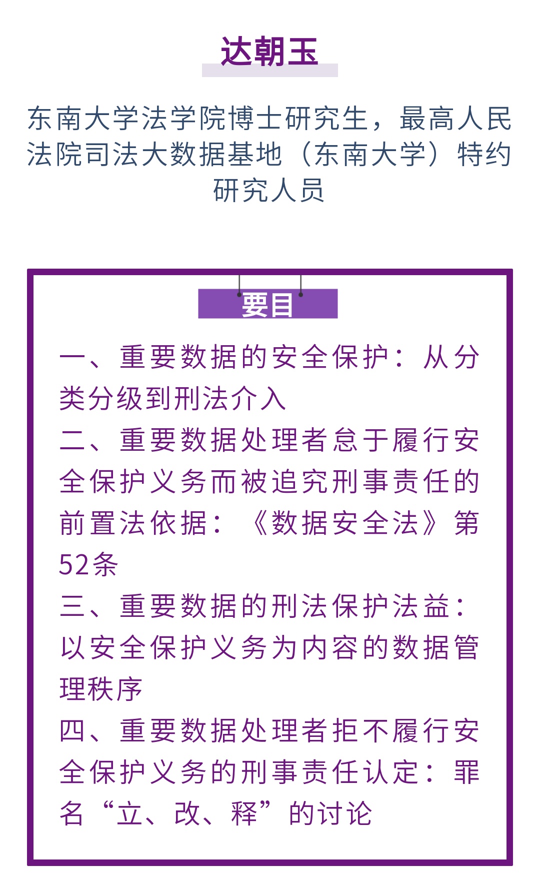 法定犯必须坚持罪刑法定原则。行政犯在构成要件上通常也会有“非法”“违反……规定”等表述,指引司法工作人员在认定犯罪时援引特定的行政法规范。从而在法定犯构成要件符合性判断上才能全面而充分地判断法定犯构成要件符合性。因此,前置法的认定就必须要做到准确无误,针对重要数据,应该从《数据安全法》第52条切入探讨重要数据处理者的刑事责任。纵观整部《数据安全法》,条文当中有“追究刑事责任”表述的是第45条和第52条。但是针对重要数据处理活动,能够直接援引的条文应该是第52条。理由有二:第一,第45条无法精准描述重要数据。《数据安全法》第45条第1款针对数据处理者违反一般数据、重要数据安全保护义务只设定了行政处罚,没有设定刑事处罚;第2款针对核心数据设置了行政责任和刑事责任。根据数据分级规则,重要数据与核心数据是两个不同的概念,基于行刑衔接从第45条切入探讨重要数据的处理者的刑事责任并不恰当。第二,第52条的兜底性描述能够涵盖整个《数据安全法》的违规行为。《数据安全法》共分为七个章节,除去作为附则的第七章,第六章的法律责任部分即是位于最后面的惩罚性表述。而第52条起到了总结全法的概括性作用,即“违反本法规定,给他人造成损害的,依法承担民事责任。违反本法规定,构成违反治安管理行为的,依法给予治安管理处罚;构成犯罪的,依法追究刑事责任”。从条文表述来看,“违反本法规定”是指违反数据安全制度、数据安全保护义务、政务数据安全与开放的内容。对于重要数据而言,可由第52条直接对应到例如第21条“重要数据的国家重点保护”、第27条“重要数据的处理者职责范围”、第30条“重要数据的处理者风险评估义务”、第31条“重要数据处理者跨境安全管理义务”等具体条文。可见,第52条起到了针对性“锁定”整部法律中的各种违规行为的作用。三、重要数据的刑法保护法益:以安全保护义务为内容的数据管理秩序刑法具有保护法益不受犯罪行为侵害的机能,同时刑法中犯罪的设立与认定都必须遵守法益保护原则。对于数据犯罪的法益而言,学界有诸多观点。有观点认为数据犯罪的保护法益是国家数据管理秩序。有观点认为,应当以数据的保密性、完整性和可用性作为数据安全法益的具体内容并受到独立保护。也有学者基于数字经济发展风险的影响因素,认为应采取“消极预防+积极利用”的数据安全法益观。这些观点面向广义的数据犯罪,都具有合理性,但是,面对因数据分类分级的级别特征和其造成严重后果可能性的重要数据而言,依然缺乏针对性,无法完全发挥法益指导立法和规范解释的机能。那么,对于重要数据而言,法益内容究竟是一种生活利益、经济价值抑或是一种秩序状态?法益不是对规范的重述,而是具有独立价值的实体概念,法益标签化的实质是变相的规范论,必须予以警惕。在本文看来,《数据安全法》《网络数据安全管理条例》(征求意见稿)赋予重要数据的处理者积极性和更为严格的重要数据安全保护义务,重要数据安全区别于信息网络内容的安全,强调的是重要数据本身及数据处理活动的安全,确保其处于有效保护、合法利用的状态。数据立法中针对数据处理者的法条均为强制性义务要求,并非以是否造成经济损失为判断标准,其重点在于规范数据处理者的行为,所以,首先可以确定对其应采取“秩序化”保护模式。但是,在我国数据犯罪刑事立法与司法适用均陷入困境的背景下,拒不履行重要数据安全保护义务的数据处理行为所侵犯的法益是否就是数据安全管理秩序?还需要进一步梳理和确定。刑法采取“财产权属保护模式”难以满足对重要数据的全面保护