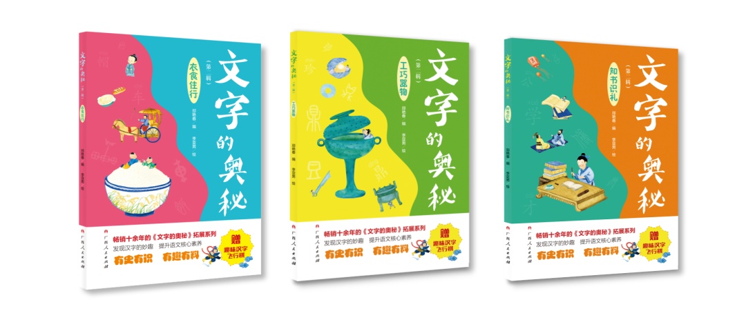 汉字是中华文化数千年延绵不绝的重要载体。《文字的奥秘》(第二辑)包含《衣食住行》《知书识礼》《工巧器物》三册,内容包含华衣美服、殿堂楼阁、称谓常识、民俗风情、食饮炊具、家居用品等十四个板块,选取有代表性的汉字,让小读者全面感受中华文化的博大精深。
