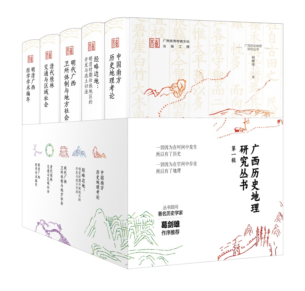 丛书由著名历史学家葛剑雄担任顾问,并作序推荐;由广西知名历史学者郑维宽、江田祥担任主编,汇聚了国内众多历史地理学权威学者担任编委。丛书第一辑入选广西优秀传统文化出版工程。第一辑五卷包括《中国南方历史地理考论》(刘祥学著)、《经略边地:明清时期壮族地区的开放与改土归流》(蓝武著)、《明代广西卫所体制与地方社会》(范玉春著)、《清代桂林交通与区域社会》(刘方进、江田祥著)、《明清广西经学学术编年》(由迅编著),丛书希冀从历史和地理的双层维度,融时间与空间于一体,探寻广西旧日的足迹,思索广西的现在和未来,通过系统梳理广西的历史与地理,总结历史时期广西人地关系变迁特点,为当下广西经济社会发展提供历史借鉴。