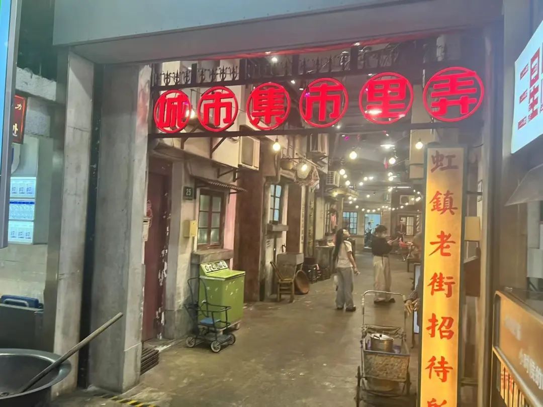 在B2楼,小虹又被来福士的“城市集市·里弄”深深吸引,这里有光怪陆离的大灯牌、古早的公交车站牌、卖糖画和卖玉兰花的小摊、有年代感的电视机、贴着流川枫海报的洗衣机、录像厅、简易的乒乓球台、放在弄堂里乘风凉的竹椅等等。