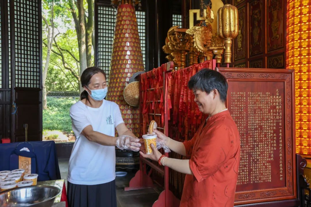 每年农历七月十四这天,上海方塔园天妃宫会惯例为市民游客免费送上豆浆、油条。记者在方塔园天妃宫内看到,一块展板上详细记录了李待问的生平事迹。清顺治二年(1645年),清兵围松江城,松江府知府李待问率军固守松江城。李待问将家中仅有的几斗黄豆磨成豆浆,分发给守城军民。那天正好也是李待问的生辰,后来松江城失守,李待问慷慨就义。松江民众为了纪念他,于1776年在现今的方塔园天妃宫西北侧,建造了一座府城隍庙,尊其为“府城隍”。为了纪念他,当时的人们以油条代替寿面,这个习俗由此一直延续至今。“我是土生土长的松江人,今天早上7点我就来了,来参加这项每年一次的纪念活动。”吴阿姨说。