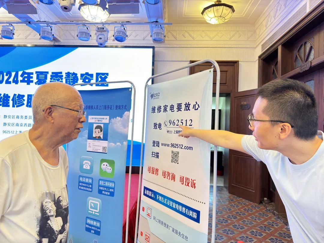 在南京西路街道社区服务现场,一位爷叔前来咨询。工作人员询问爷叔家里洗衣机的具体品牌、故障表现后回复道:“出现这个问题,您可以拨打上海家电服务热线962512报修、咨询,也可以拨打电器品牌统一服务电话,提供上门服务。”说话间,就把一张上海家电品牌产品售后服务综合信息宣传单递到爷叔手上。