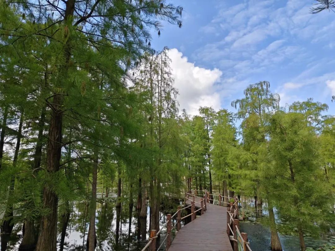 李中水上森林公园以其独特的垛田地貌和茂密的水上森林闻名遐迩。这里的水杉树高耸入云,树干笔直挺拔,形成一道道绿色的屏障。漫步在浮桥之上,四周是波光粼粼的水面和郁郁葱葱的树木,仿佛置身于一个巨大的绿色迷宫之中,清凉感油然而生。