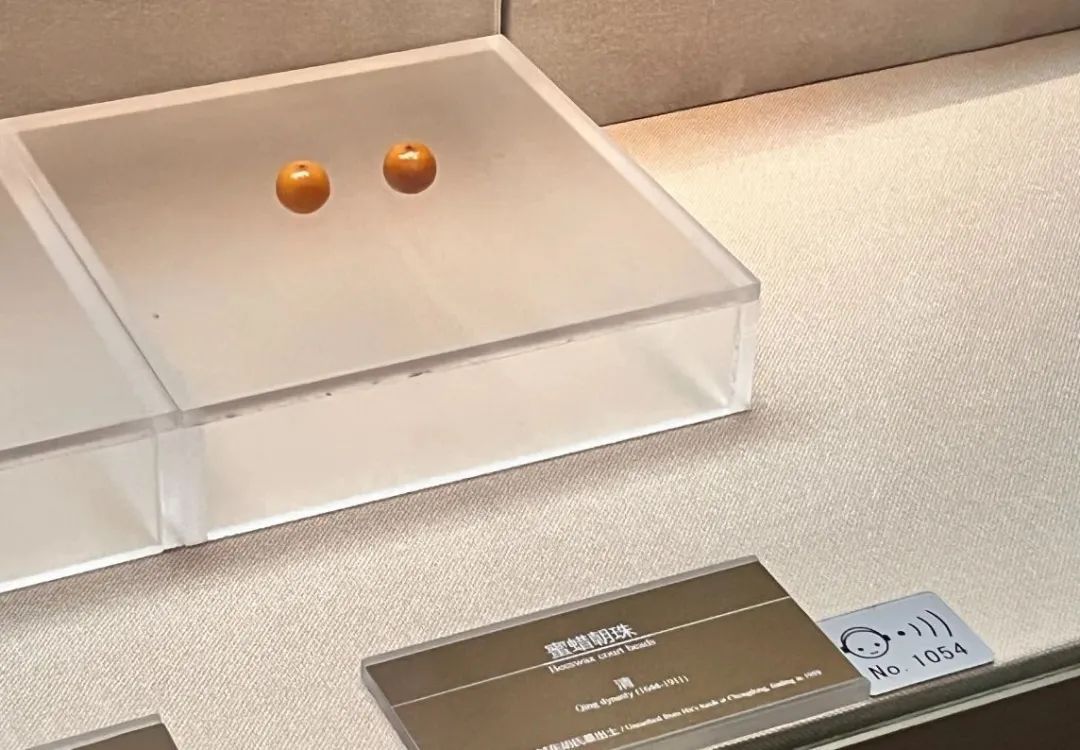 活动伊始,在讲解员的带领下,小朋友们欣赏了陈列于嘉定博物馆内的蜜蜡朝珠。两颗蜜蜡朝珠细腻油润,在灯光下晶莹透亮,立马吸引了小朋友们的眼球。
