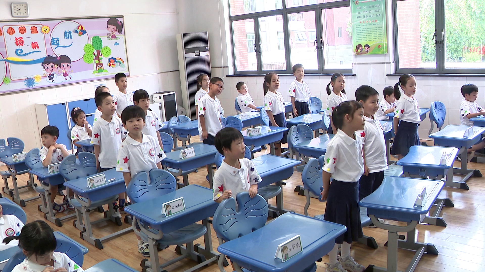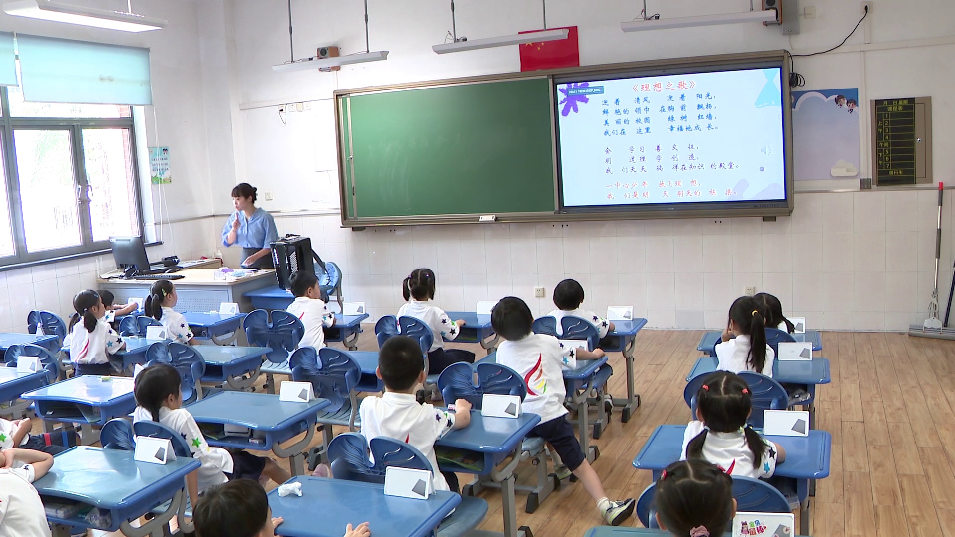 在音乐老师的课堂上,孩子们正在学唱校歌,经过两天的学习,多数孩子们已经能够模有样地歌唱了。连同学告诉记者,这几天在学校里学到了很多知识,还结交了很多朋友,很期待新学期的到来。