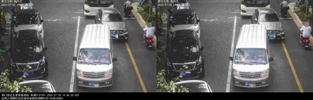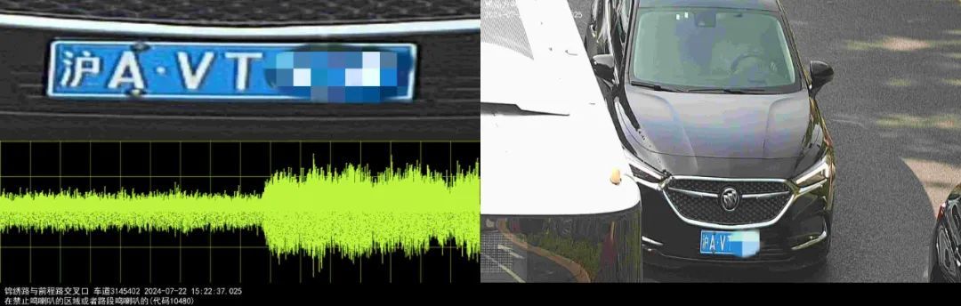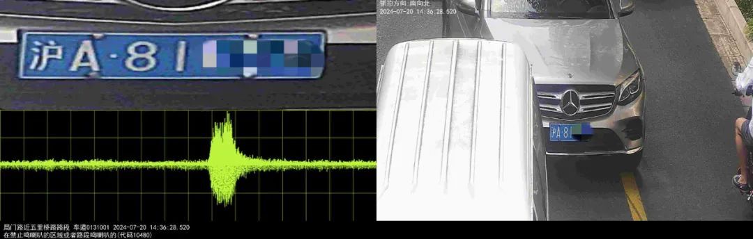 ▲2024年7月20日14时36分,号牌为沪A81***的小型普通客车在局门路近五里桥路路段,实施了“在禁止鸣喇叭的区域或者路段鸣喇叭的”违法行为。