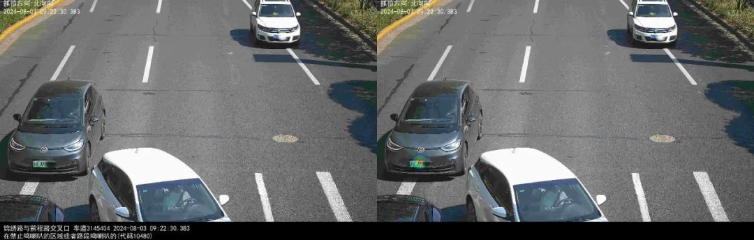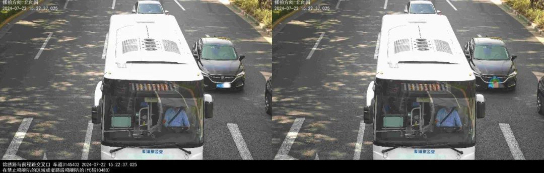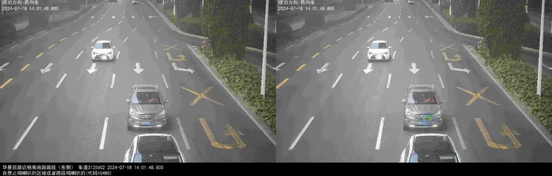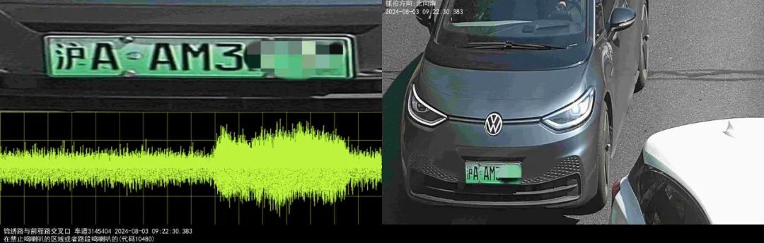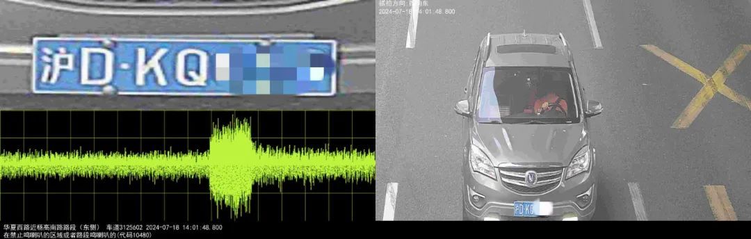 ▲2024年7月18日14时1分,号牌为沪DKQ***的小型轿车在华夏西路近杨高南路路段,实施了“在禁止鸣喇叭的区域或者路段鸣喇叭的”违法行为。