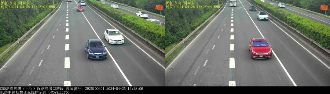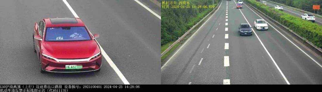 ▲2024年4月25日14时28分,号牌为沪AA37***的小型轿车在G50沪渝高速(上行)近赵巷出口路段,实施了“机动车违反禁止标线指示的”违法行为。