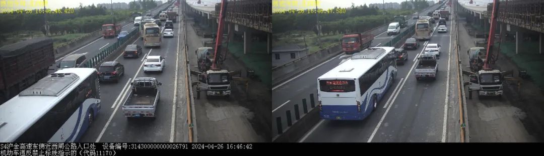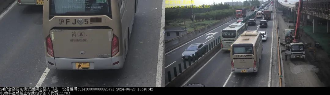 ▲2024年4月26日16时46分,号牌为沪FJ5***的大型普通客车在S4沪金高速东侧近西闸公路入口处,实施了“机动车违反禁止标线指示的”违法行为。