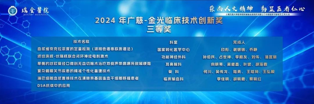 瑞金医院始终坚持创新,把创新成果扎扎实实地写在百姓的健康上。2020年,医院首次开展广慈临床技术创新奖评选,由王振义院士捐赠的基金,奖励具有创新性的临床技术。每年评选5项瑞金医术,一二三等奖若干,是瑞金新技的重要展示窗口。