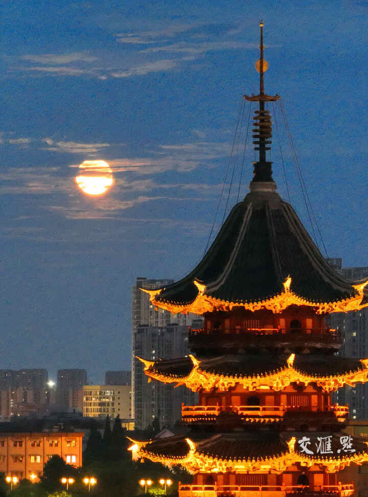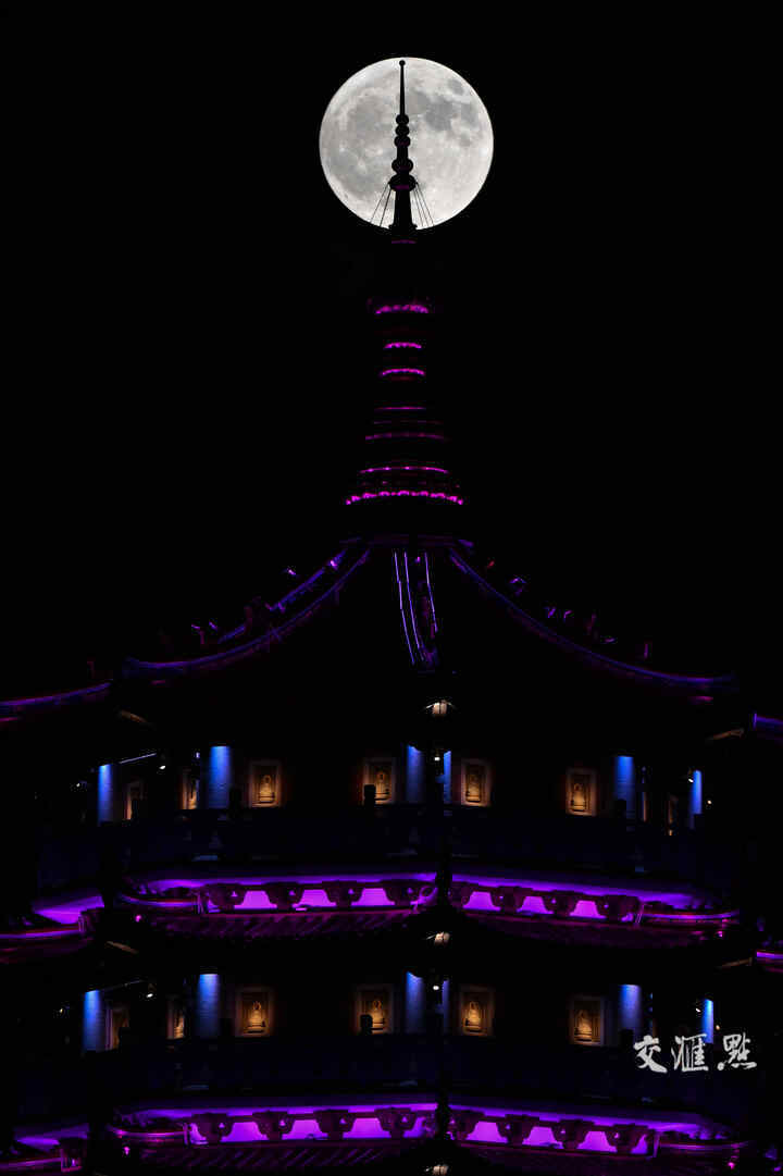 8月19日18时59分,昆山市,“近地点满月”从慧聚寺上空升起。袁新宇 摄 视觉江苏网供图