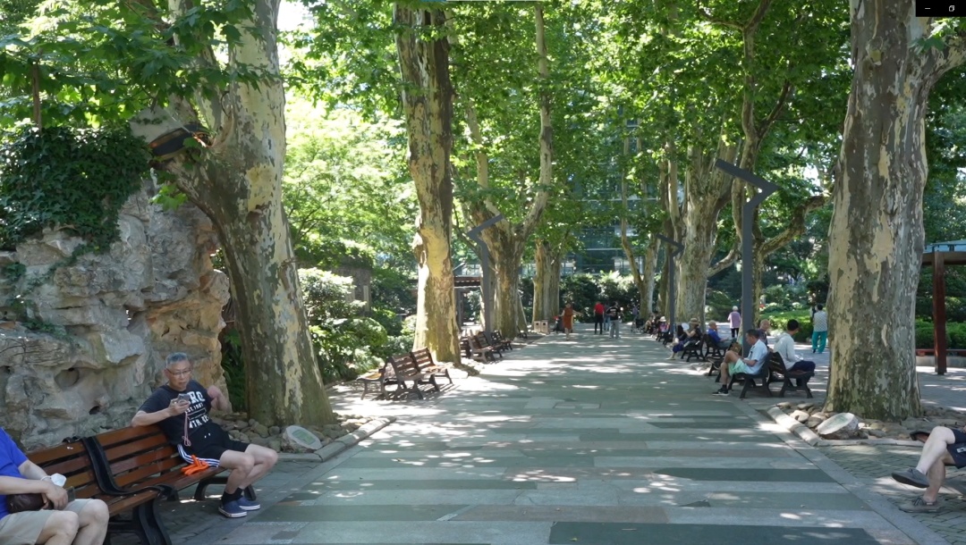 走下天桥,有一处闹中取静的绿地——静安公园。高大的悬铃木构成了美丽的林荫大道,给人们带来荫凉与心灵的沉静。