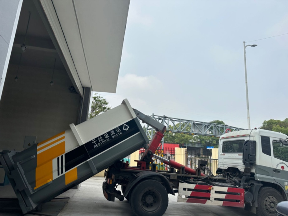 目前,浦东新区共有区属管理小压站77座,每天在对周边所辐射居民区产生的生活垃圾进行压缩装箱后,拉臂车会负责将箱皮拖运至下一道处置工序(中转站、处置场所等)。