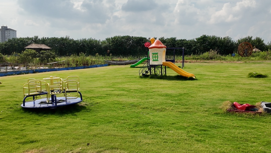大片的种植区域之外,彩色的滑梯、旋转木马、秋千和攀爬架错落有致地分布在视野开阔的场地上,旁边还设置了游客休息区域,带娃的同时远眺远方,忙碌的生活中来这里去一去“班味”。