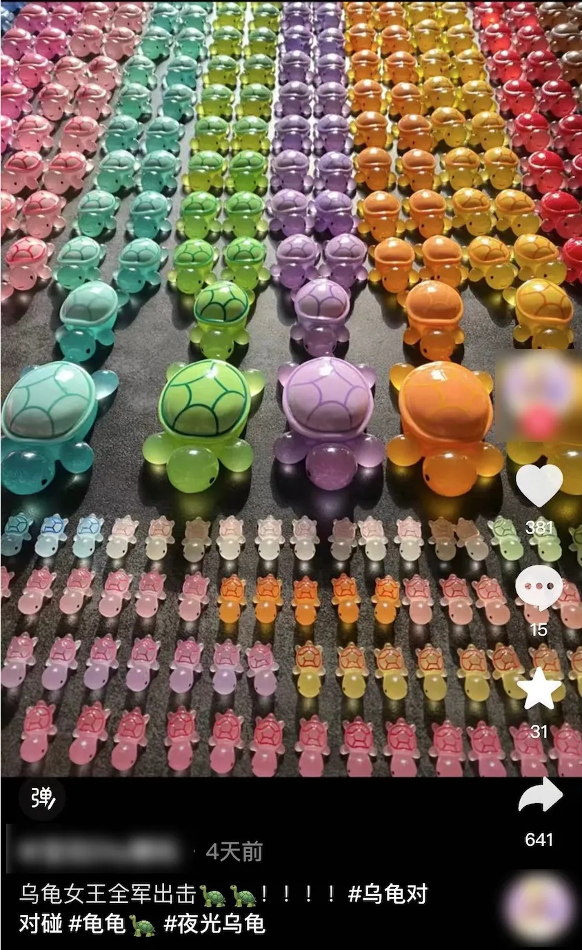“乌龟对对碰”是近期在网络直播平台上流行的一种盲盒玩法。- 消费者需先购买数包盲袋或者盲盒(每包一个乌龟),并许愿一种颜色。网络直播间的卖家会挂出几种“套餐”,如××元拆4包,××元拆9包套餐等。