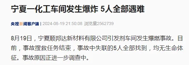 据央视新闻报道,8月19日14时许,宁夏顺邦达新材料有限公司引发剂车间发生爆燃事故。目前,事故搜救任务结束,事故中失联的5人全部找到,均无生命体征。事故原因正进一步调查中。