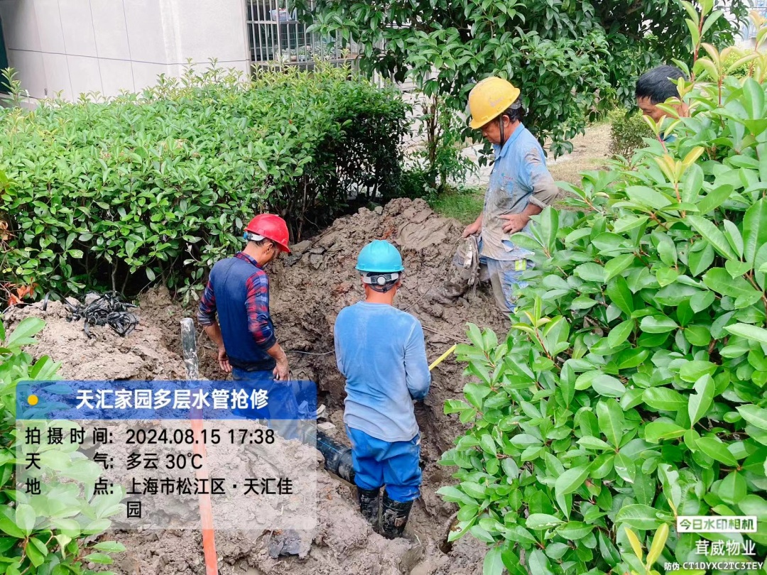 当天下午,有居民路过发现天汇佳园小区中心广场附近的水管疑似破损。接报后,负责小区物业管理的上海茸威物业管理有限公司第一时间派人前往现场勘查,并立即联系松江自来水公司抢修组进驻小区抢修。经现场勘察发现,该小区一楼道总管道出现漏水点,但因为管道沉降已经无法维修,需要更换新管道。