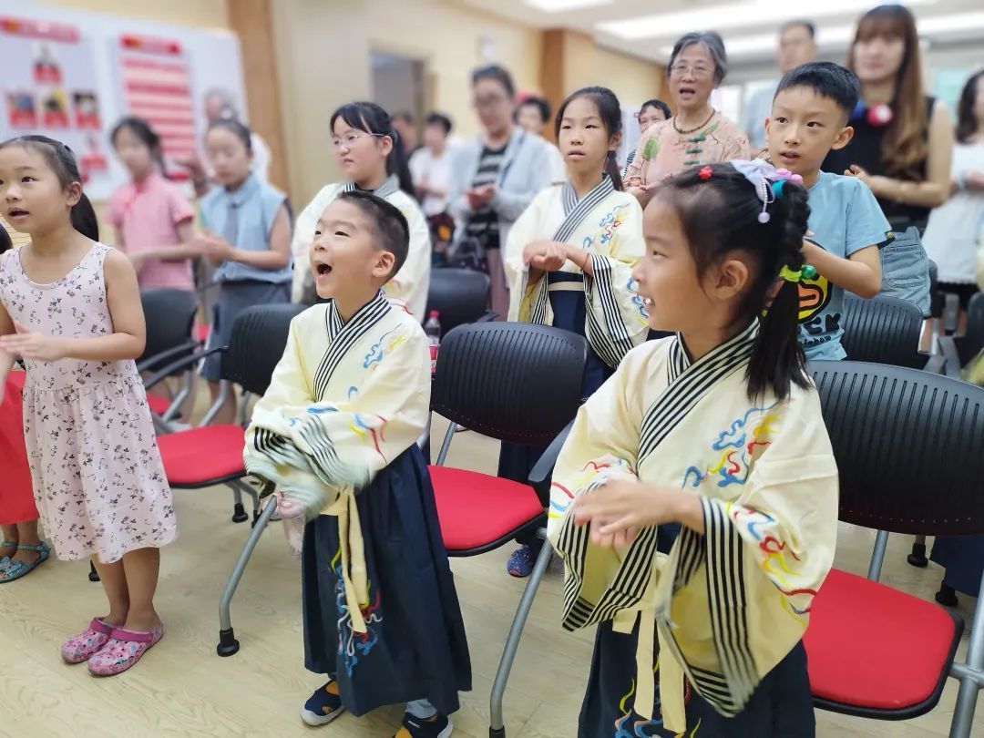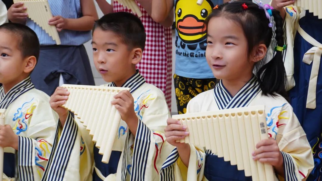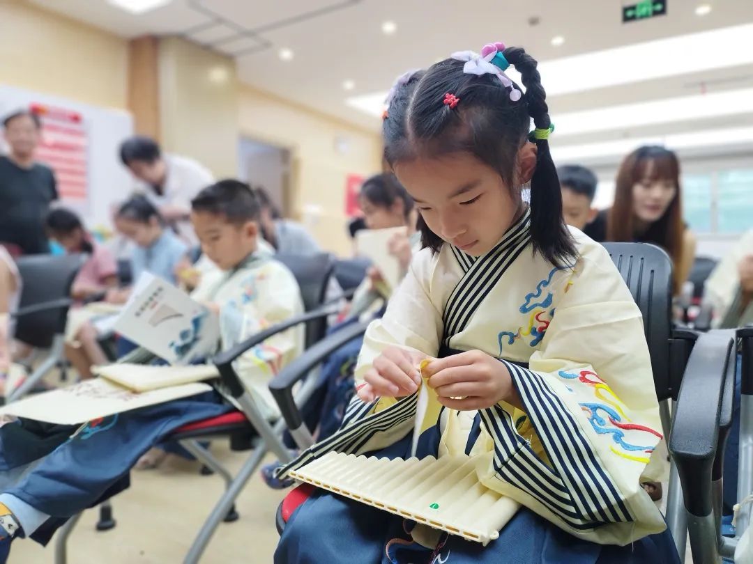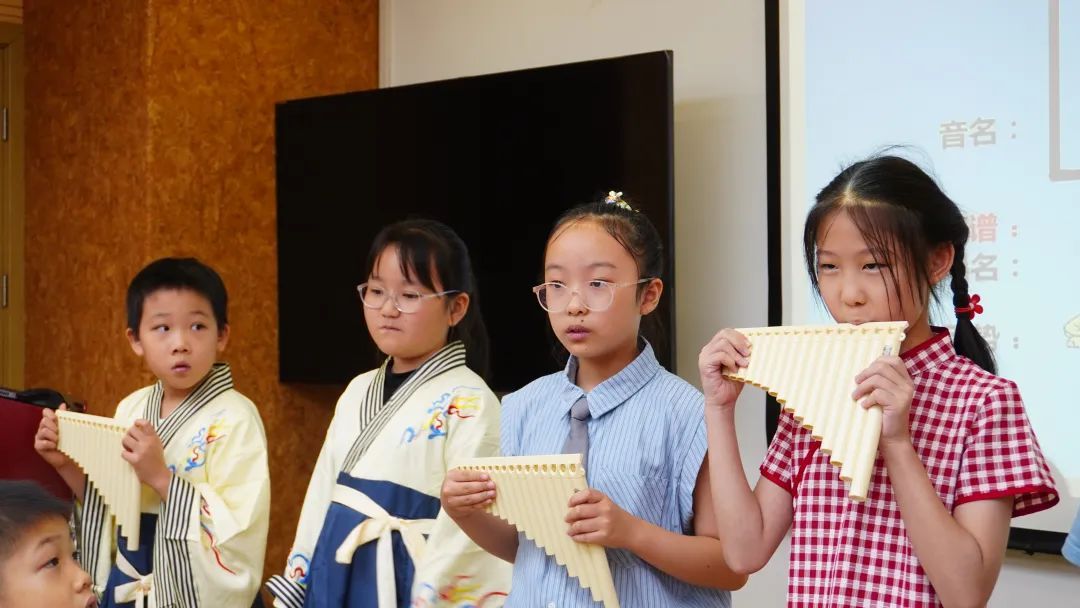 活动中,孩子们身着精美的传统汉服,仿佛穿越时空,置身于古代雅致的音乐殿堂。陈杰生动地向孩子们讲述了排箫这一古老乐器的悠久历史、精妙构造以及吹奏技巧。
