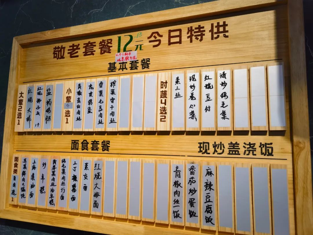 该社区食堂位于泽悦路80号,店铺名为“沪口铺”,内有两层,居民可以堂食或打包。居民可选择一大荤一小荤两素的敬老套餐,或选择店内的面食套餐或是单点炒菜,付款时,系统会自动根据敬老卡、残疾证等相应的优惠标准结算。