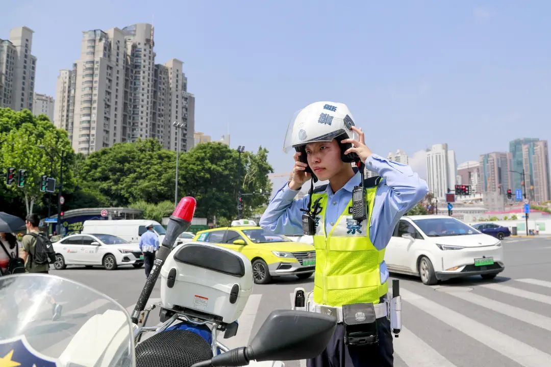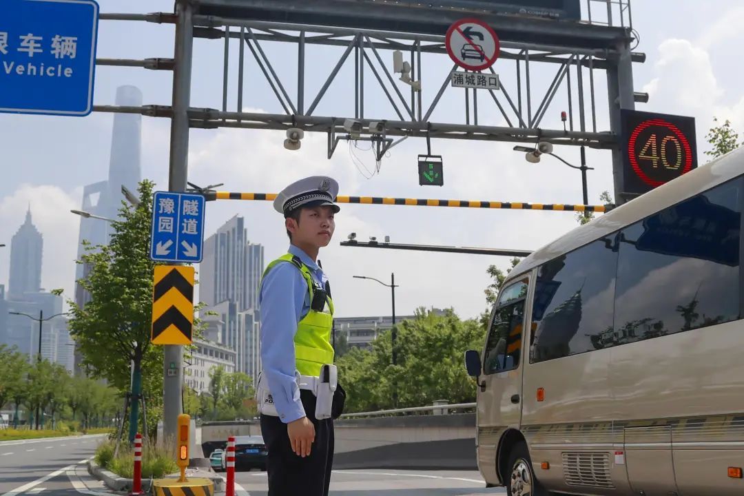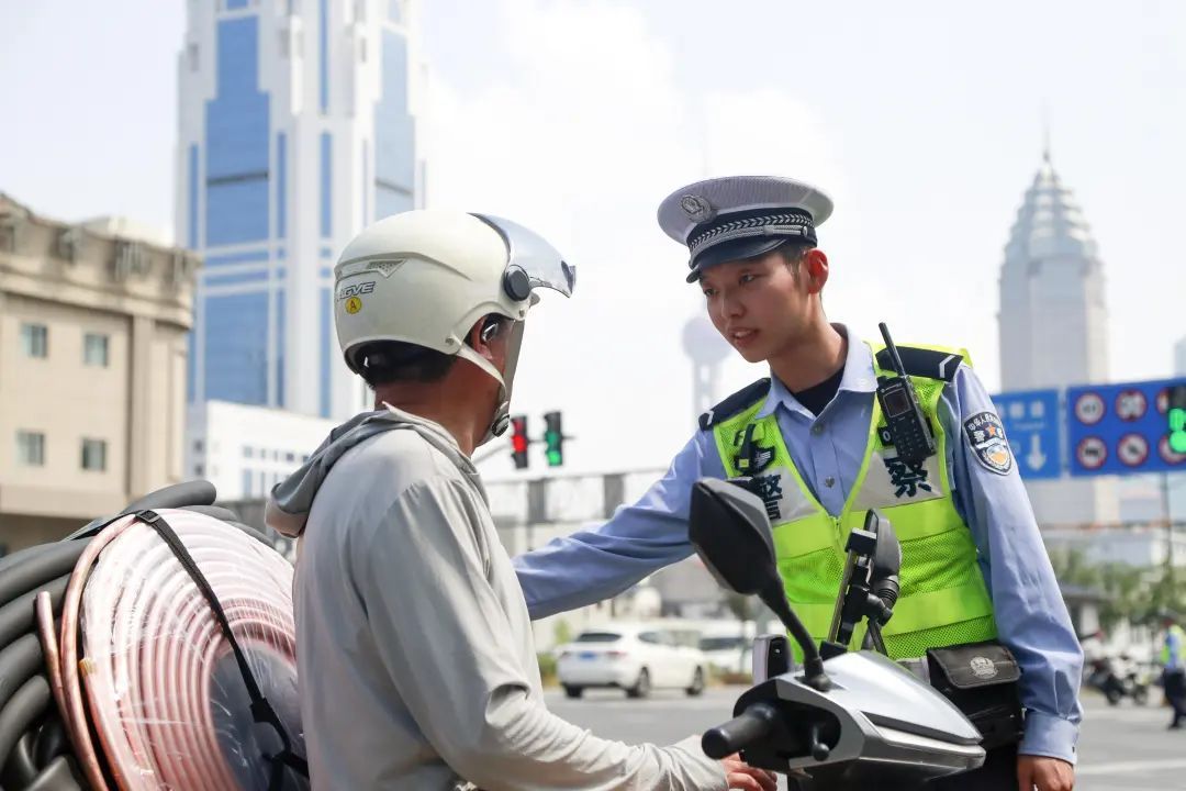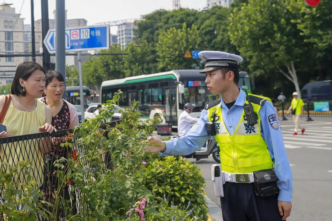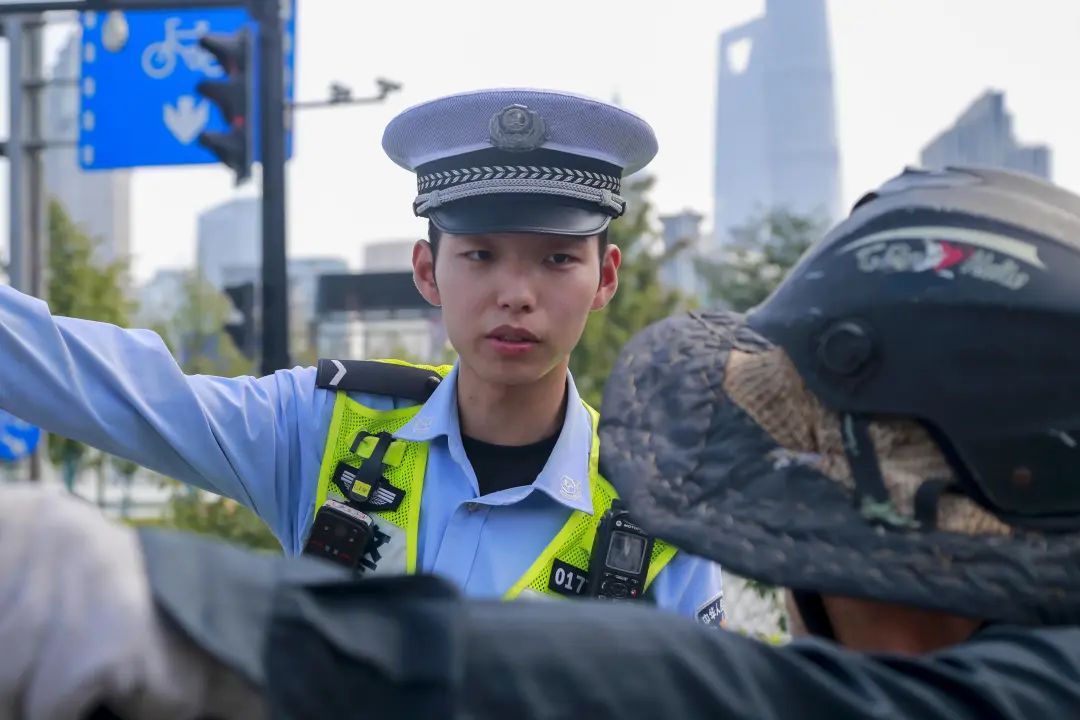 “天气炎热,大家也容易心浮气躁,但交通安全容不得半点马虎。”在人民路河南南路,梁骏杰时而在路口中央疏导交通,时而站在隧道口注意来往车辆,不一会又出现在人行道旁为游客指路,“因为这里靠近豫园,游客一出地铁站经常分不清东南西北,首选问路的对象一定是身穿制服的我们。”每天梁骏杰都会遇上数不清的游客询问哪条路在哪、这个景点是哪个方向,他的每一句回答中都传递着耐心与责任。说话间,梁骏杰突然发现一辆电瓶车后座堆放的物品超出了规定尺寸,他又赶忙上前提醒。