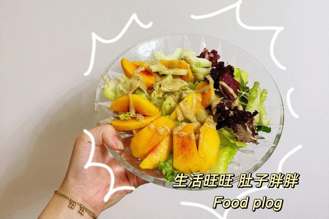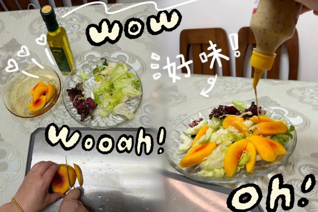 先将黄桃去皮切成小块,准备个人爱吃的蔬菜种类,将蔬菜洗净后均匀放入盘中。然后根据自己口味加入橄榄油、黑胡椒碎、寿司醋(可以用柠檬汁取代),倒入沙拉酱,进行调味。另可以根据自己口味加入虾仁、鸡胸肉等。最后将所有食材拌匀,一份黄桃沙拉就制作完成啦!
