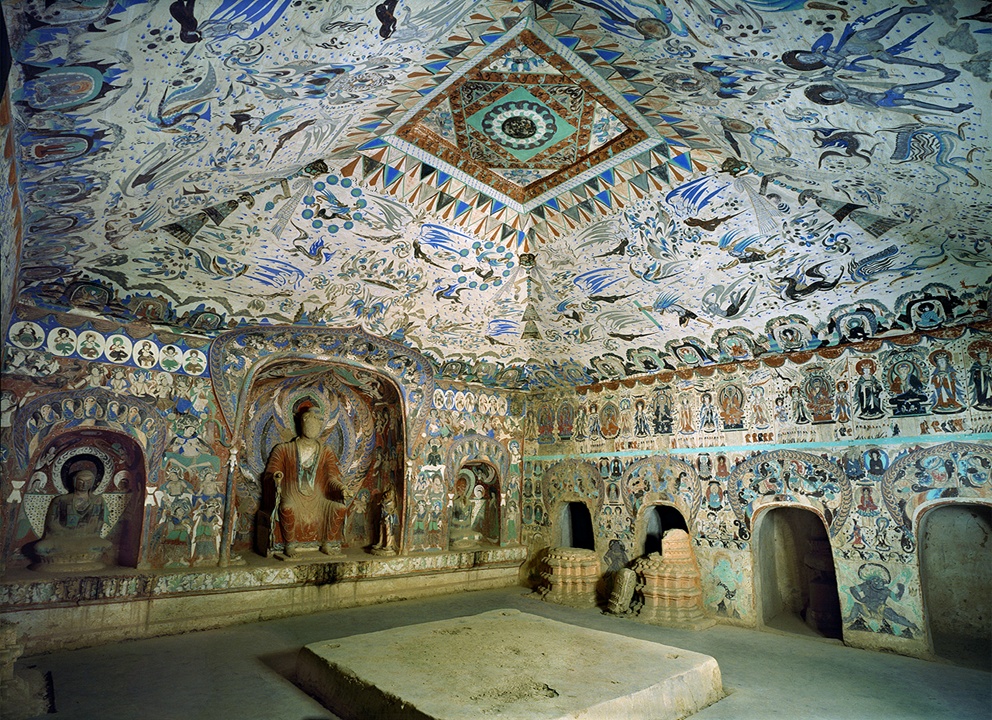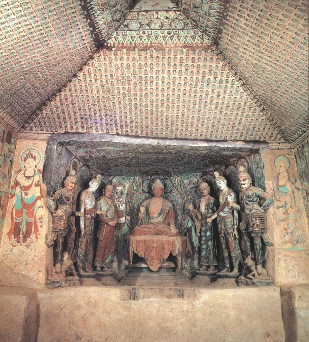 第285窟位于莫高窟中部二层,主室为覆斗顶方形窟,窟正壁(西壁)中央大龛内塑善跏坐佛,两侧小龛内各塑禅僧像,左壁(南壁)、右壁(北壁)各开四个禅窟。此窟保存完好,其右壁有西魏大统四、五年(538、539年)的造窟题记数方,是莫高窟最早有纪年的洞窟,对于研究莫高窟的历史和艺术,均有十分重要的意义。