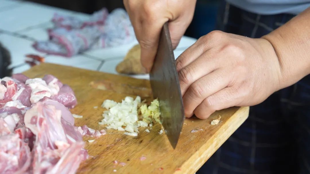 沈建中熟练地将处理好的鸭块放入锅中焯水,去除腥味后捞出。接着,锅中加入少许油,随着油温升高,葱姜蒜被放入锅中,瞬间爆发出浓郁的香气,那是土灶头独有的烟火气,瞬间弥漫了整个厨房。