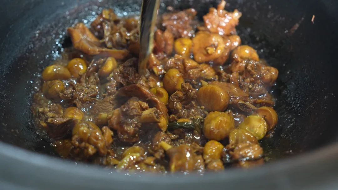 随后,鸭肉块被放入锅中,伴随着“嗞啦”一声,鸭肉表面迅速收缩,色泽渐变为金黄,释放出浓郁的肉香。再放入酱油、啤酒等调料,在锅铲的不断翻动下,鸭肉逐渐呈现出诱人的色泽。接着将剥好的板栗轻轻投入锅中,与鸭肉一同翻炒。空气中弥漫着肉香、酱香、酒香……令人垂涎欲滴。