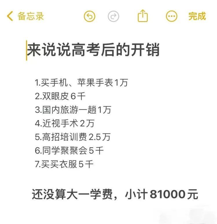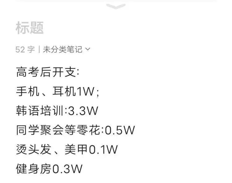 考虑到女儿平时学习辛苦,高考结束当天,她为女儿买了部新手机作为奖励,加上一副耳机,便花去了1万元。假期里,女儿烫头发、美甲花了1000元,健身房锻炼花了3000元,和同学出去聚会几次零花钱开销了5000多元。