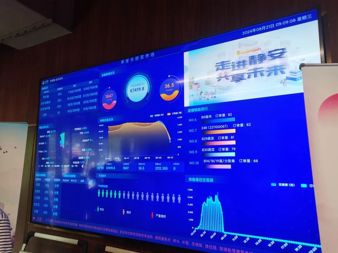 菜市场负责人带领大家首先来到了菜场的入口处,智慧大屏上实时滚动显示着平价菜的供应情况、实时交易数据、促销信息、农残检测结果以及各类菜品的实时价格,帮助消费者快速了解市场供应动态。