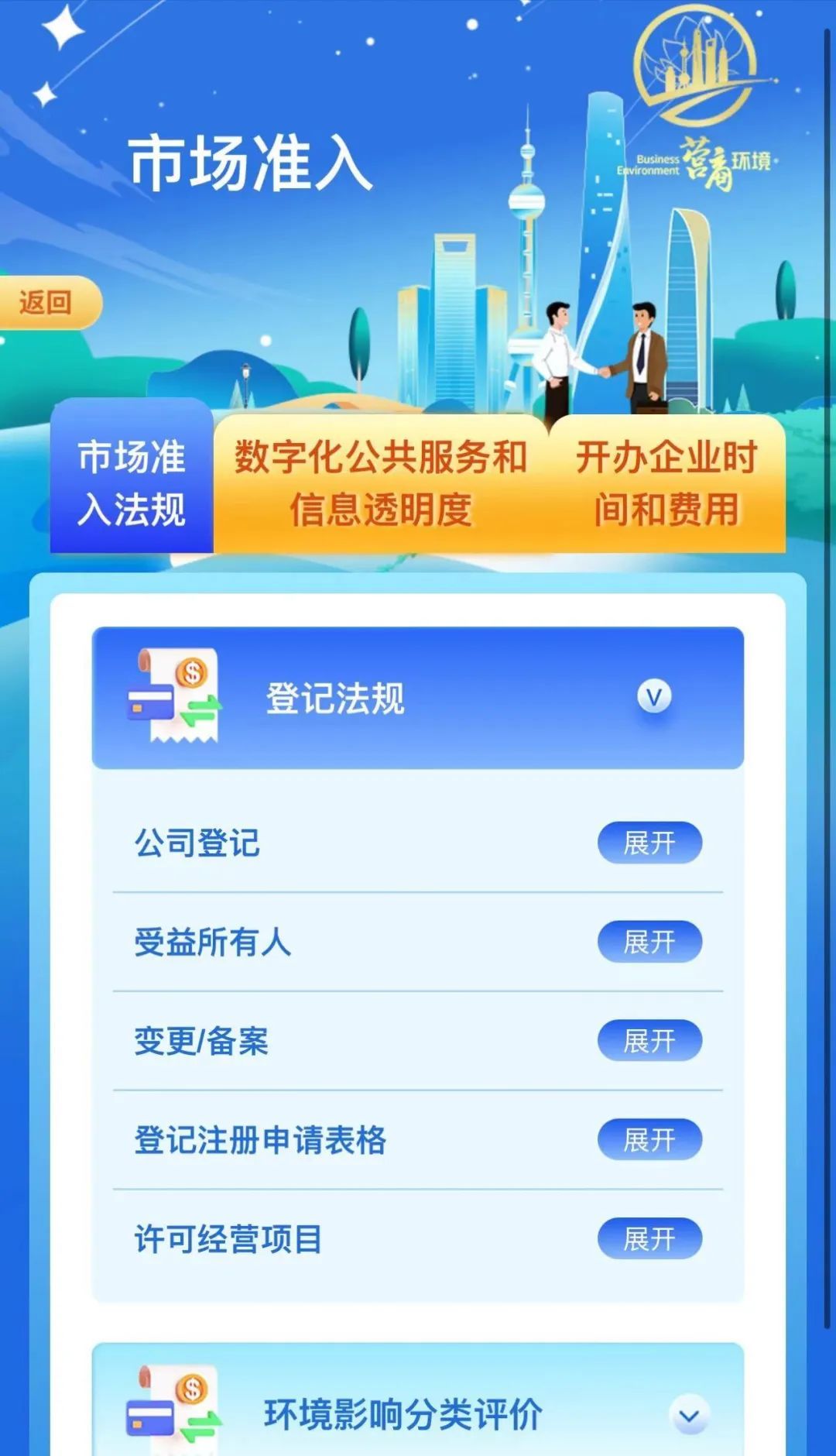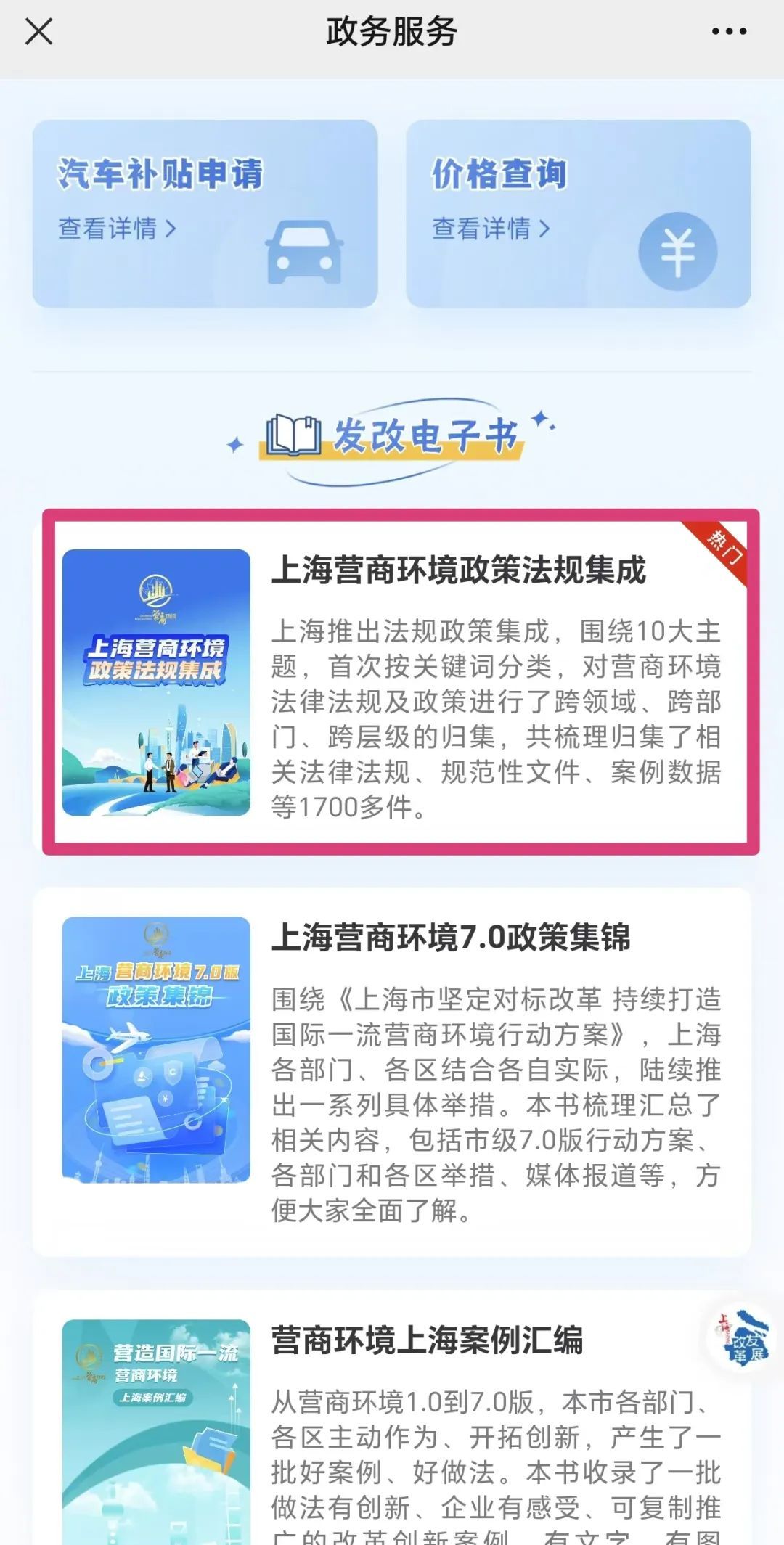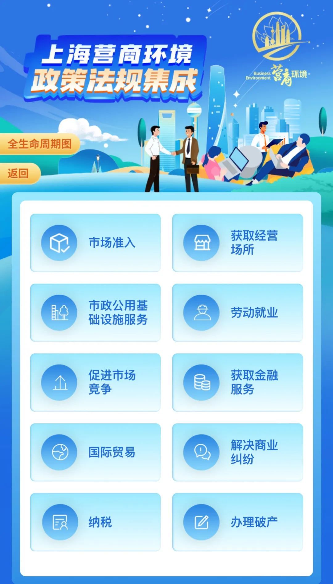 为积极回应企业关切、进一步提升广大企业和专业人士获取营商环境相关法规政策的便利性,8月22日,“上海营商环境政策法规集成”发布仪式在上海报业大厦举行,推出“上海营商环境政策法规集成”专栏首发上线,在全国首创实现营商环境法律法规及政策的“跨领域、跨部门、跨层级”归集,共梳理相关法律法规、规范性文件和案例数据等达1700多件。在此基础上,为进一步提升使用和查询便利,探索实现按业务领域高频关键词对政策法规进行分类,并开设了要点展示功能。专栏将通过全市各级媒体和各类商会协会平台广泛向社会、向企业传播。 如何快速查询相关领域的法律法规?一起来看→ “跨领域、跨部门、跨层级”!上海营商环境政策法规集成专栏来啦 政策法规,一站收录 跨领域,即覆盖企业全生命周期发展,包含市场准入、获取经营场所、市政公用基础设施服务、劳动就业、获取金融服务、国际贸易、纳税、解决商业纠纷、促进市场竞争、办理破产等10大重点领域相关的政策法规; 跨部门,即打破部门界限,由市发展改革委牵头组织全市共20多家部门和单位协同作战,共同完成各领域法律法规和政策文件的全面梳理;跨层级,即涵盖从国家到地方不同层级的政策法规,对各业务条线对应的国务院和国家部委以及上海市和各市级部门颁发的法律法规、条例办法以及实践案例等进行全量归集。 2. 板块清晰,内容丰富 PC版政策法规集成专栏涵盖上海营商环境的方方面面,不仅有对标改革的营商环境政策法规集成专栏,还包括营商环境工作方案、媒体报道和典型案例等。 3. 随时打开,灵活查阅 我们还同步推出了手机端政策法规集成专栏,方便大家能够使用移动设备随时随地轻松查阅。 查看路径 pc端和移动端查看路径: 渠道一:pc端 您可登陆市发改委官网,在首页左侧位置,在“专题专栏”中,点击“营商环境”,即可进入专栏。 渠道二:移动端 移动端可以通过以下2种方式查看: 1、扫描下图二维码 2、关注“上海发展改革”微信公众号,点击“政务服务”即可查看 下一步 市发展改革委将会同各部门 不断优化完善政策法规集成 为企业及时便捷获知政策 用好政策提供便利 持续打造市场化法治化国际化 一流营商环境