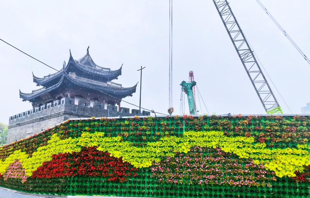 白墙褐瓦、剪影浮动、绿植满墙、鲜花成园,地铁5号线南禅寺站将自己“打扮”成景点的模样,掩映在南禅寺景区之中,如果不是工地中央高高耸立的塔吊,几乎看不出这原来是个建筑工地。