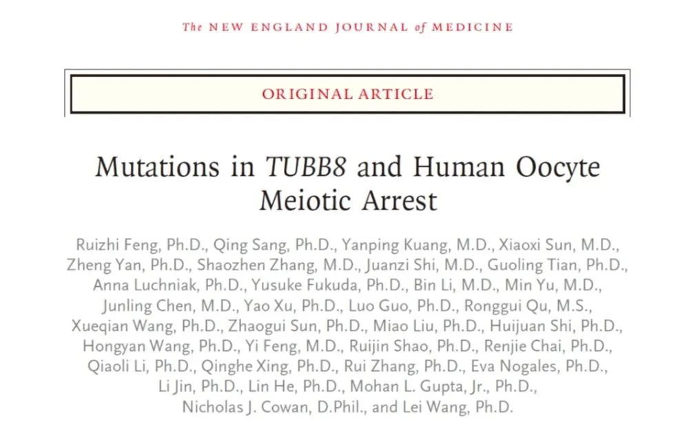 研究论文“TUBB8基因突变致人类卵子减数分裂阻滞”(Mutations in TUBB8 and Human Oocyte Meiotic Arrest)在《新英格兰医学杂志》(The NEW ENGLAND JOURNAL of MEDICINE)发表