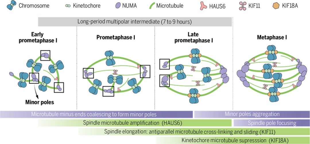 在第一次减数分裂前中期,多个“小极”组装形成典型的“多极纺锤体”,多极纺锤体状态持续长达7-9个小时。在此期间,小极的数目逐渐增多并聚集,直到第一次减数分裂中期形成两个“大极(Major pole)”,最终完成纺锤体双极化过程-多极纺锤体转变为双极纺锤体。“以上过程与有丝分裂及其他哺乳动物卵母细胞的纺锤体双极化过程截然不同,进一步展现出人卵纺锤体组装的独特机制。”王磊强调。