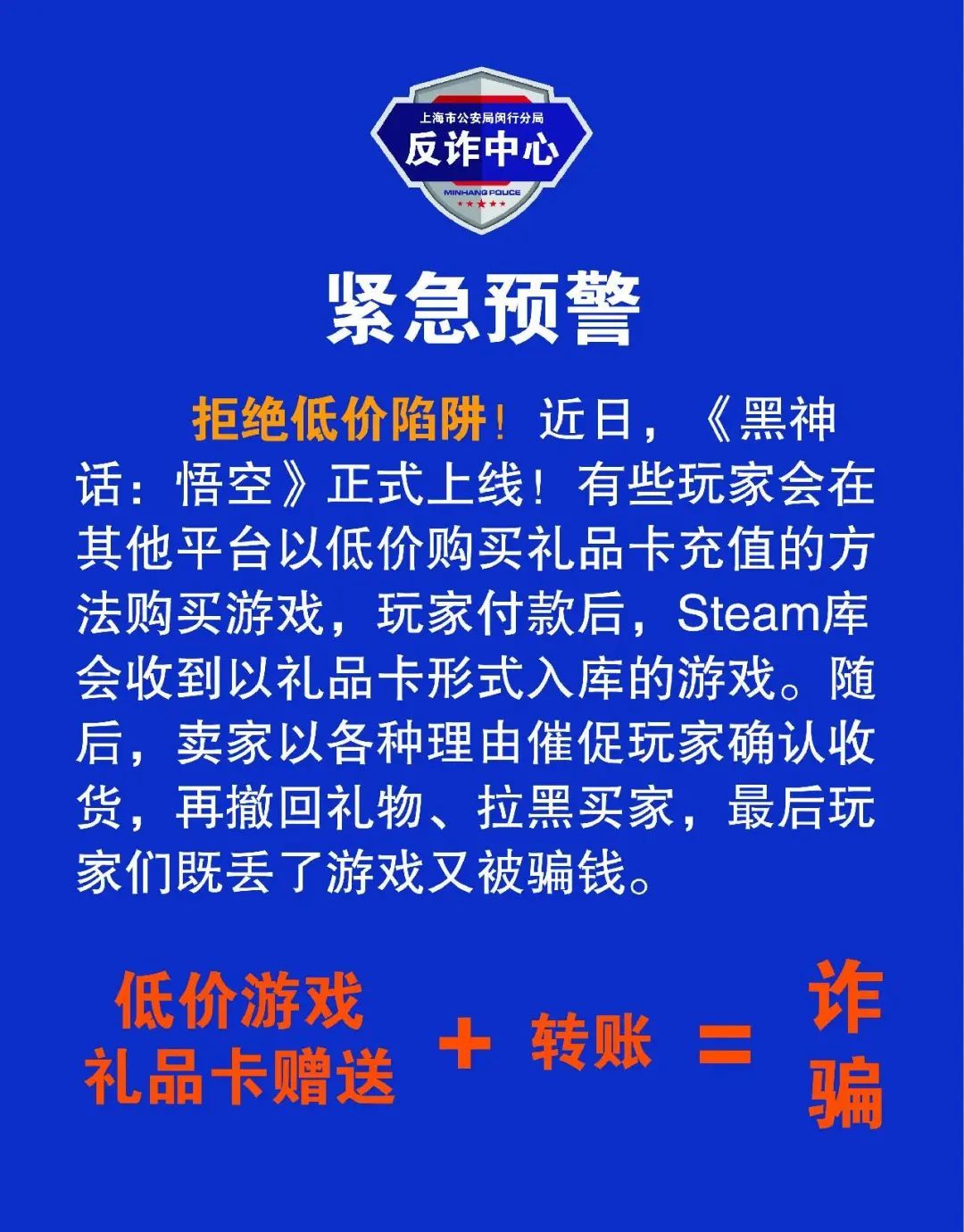 武汉市反电信网络诈骗中心介绍,当天,B站UP主“螃蟹账号”发布视频,称收到多位受害者投稿,在某二手平台购买的《黑神话:悟空》遭到卖家诈骗。