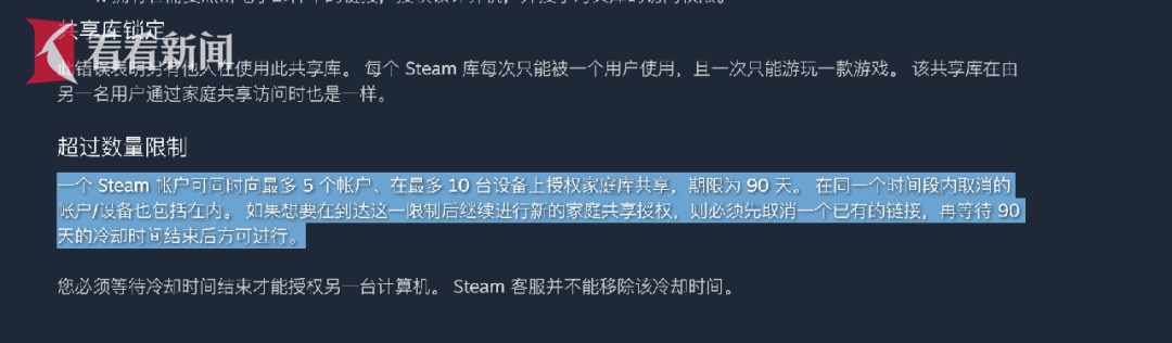 一个Steam帐户可同时向最多5个帐户、在最多10台设备上授权家庭库共享,期限为90天。