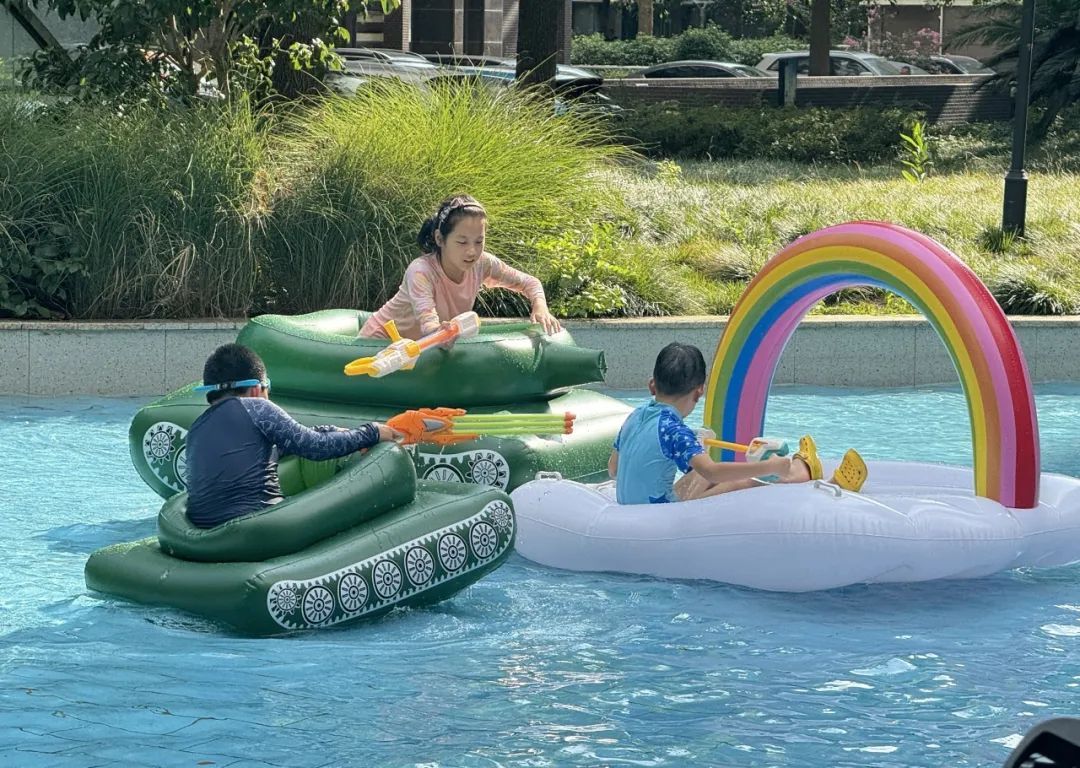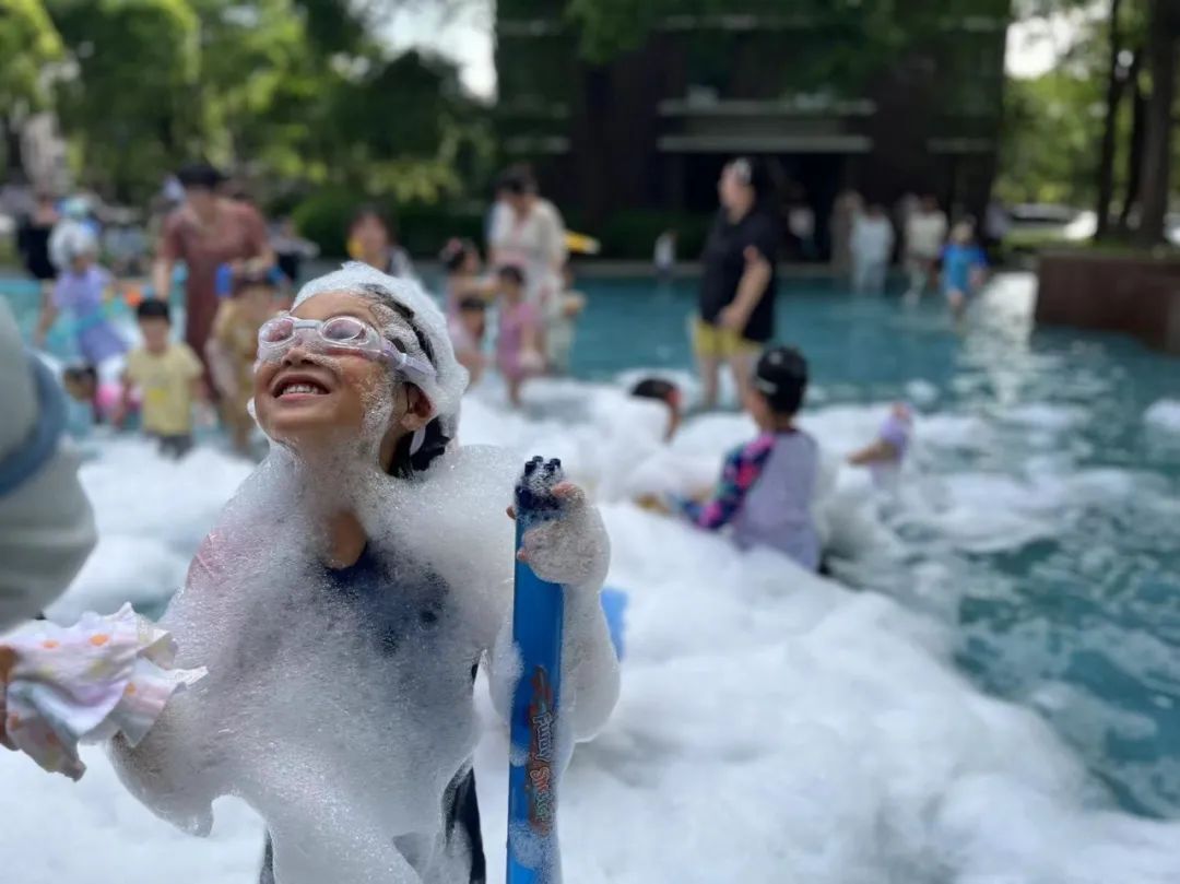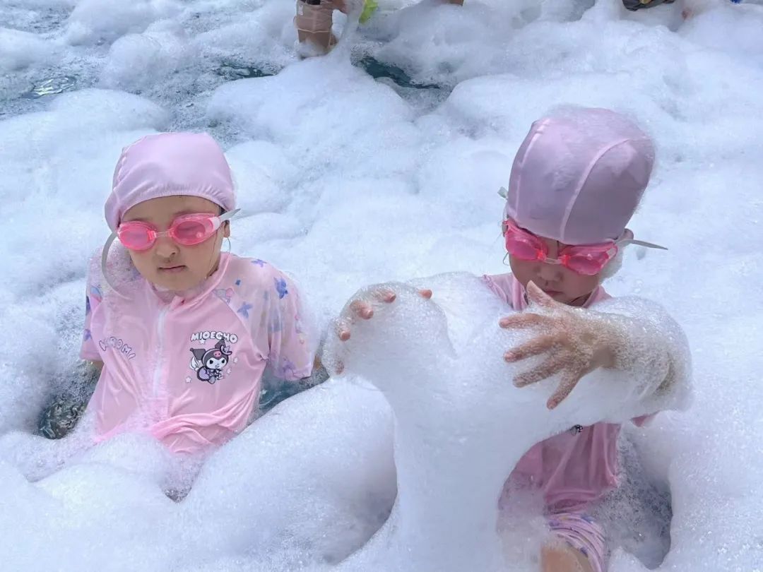 泡泡机时不时喷出云朵般的绵密泡泡漂浮在水上。孩子们有的乘坐在火烈鸟、菠萝、彩虹形状的多巴胺色充气游泳圈上,有的在泡沫中来回穿梭“凹造型”,有的和身边的小伙伴打着水仗,沉浸在欢乐海洋中。