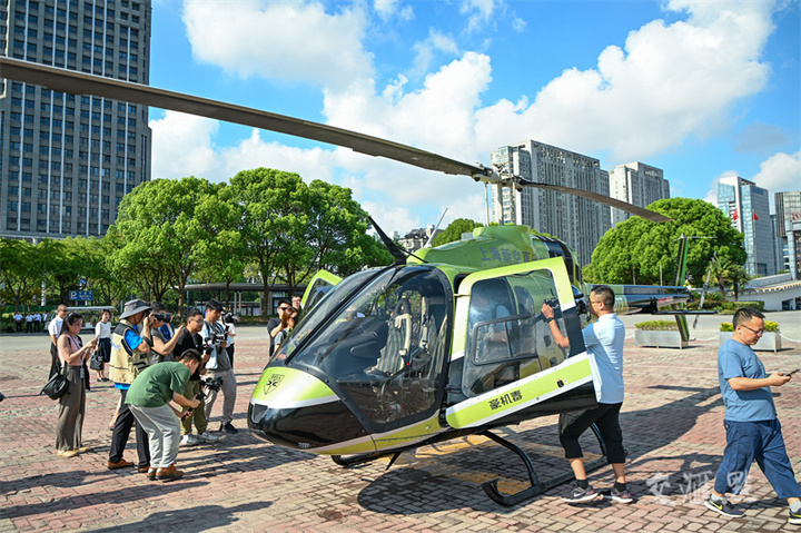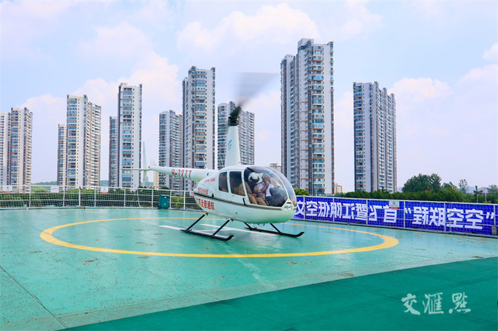 8月22日,一架搭载两名乘客和邮政快递的直升机从江阴外滩乘风而起,江阴至无锡硕放机场“空空联程”首飞暨江阴低空文旅顺利启航,为江阴低空经济发展打开了新的空间。通讯员 李一芳 新华日报·交汇点记者 赵亚玲摄