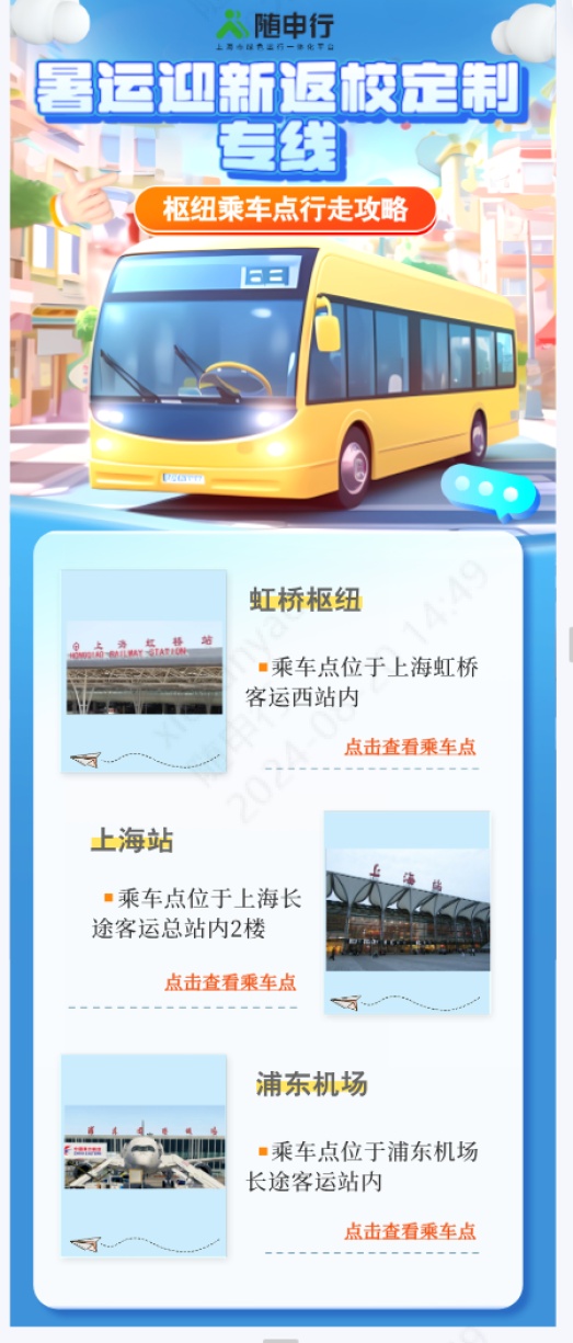 除点到点直达的定制专线外,专区还特别为2024级的新生们汇总了沪上各大高校迎新接驳线的交通信息,提供自枢纽直达高校的接驳线,或“地铁+接驳线”联程出行的信息查询服务,方便新生们一键获取运营时间、上车点等具体信息。