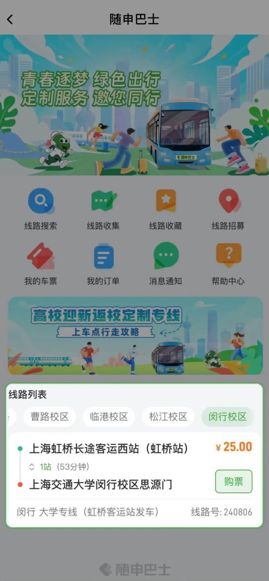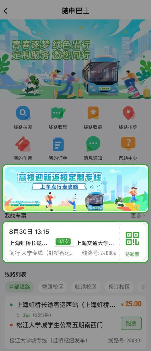该专区汇聚自上海“两场三站”交通枢纽始发至全市69所高校149个校区的出行信息,并提供10条自主要枢纽直达21所高校校区的定制专线预约购买服务,集定制专线预定、迎新接驳线查询、枢纽交通指引、地铁公交“一码通行”等功能,方便高校学子高效安排返校行程。