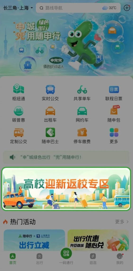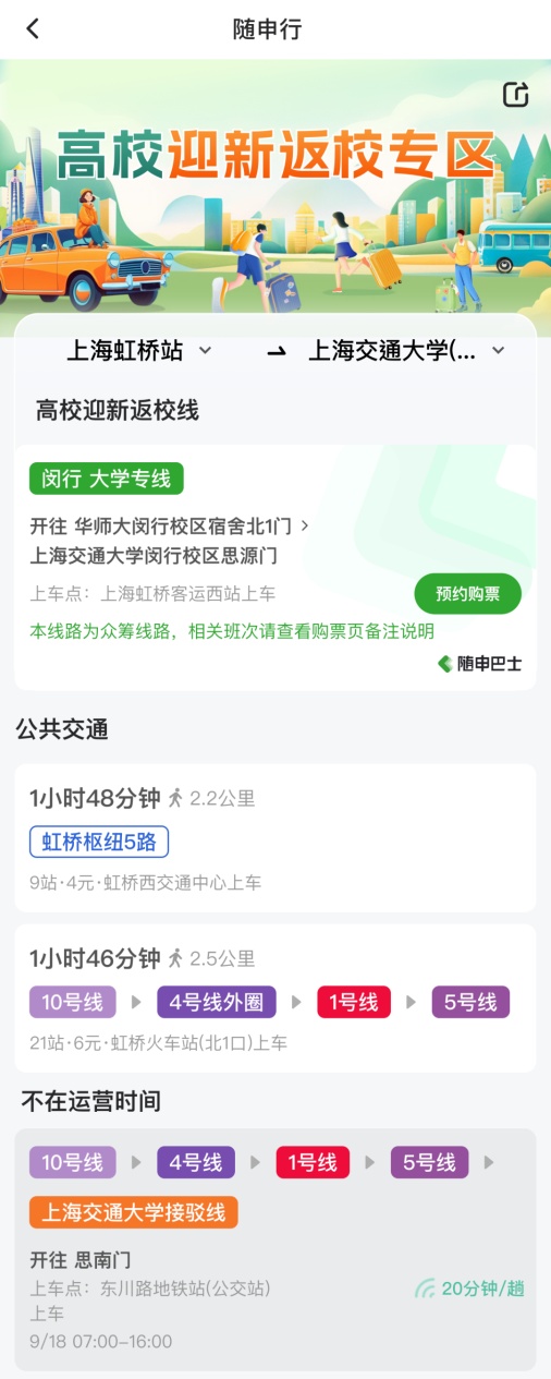 即日起至9月30日,高校学生登录“随申行”APP或微信小程序进入“高校迎新返校专区”,即可轻松获取自枢纽场站至高校校区的一站式出行解决方案。来看详情↓