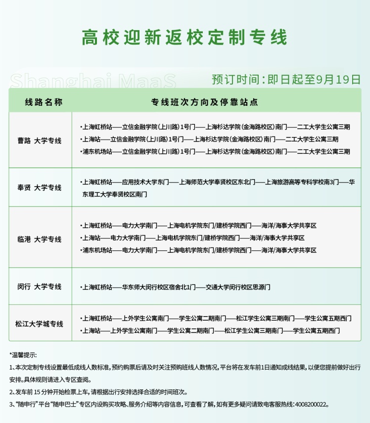 本次“高校迎新返校定制专线”开设由虹桥枢纽、上海站、浦东机场三大枢纽始发前往曹路、奉贤、临港、闵行、松江大学城等高校校区共10条线路,为学生提供从枢纽到校门的无缝出行服务。