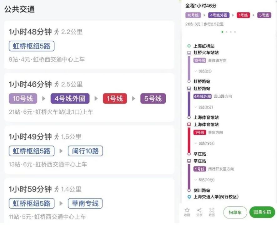 3.同时,专区“公共交通”列表还将提供多种搭乘公交、地铁的联程出行方案,为选择公共交通出行的学生们提供便利。点击“乘车码”,即可打开“随申码”(上海城市出行码)一码乘坐公交、地铁。