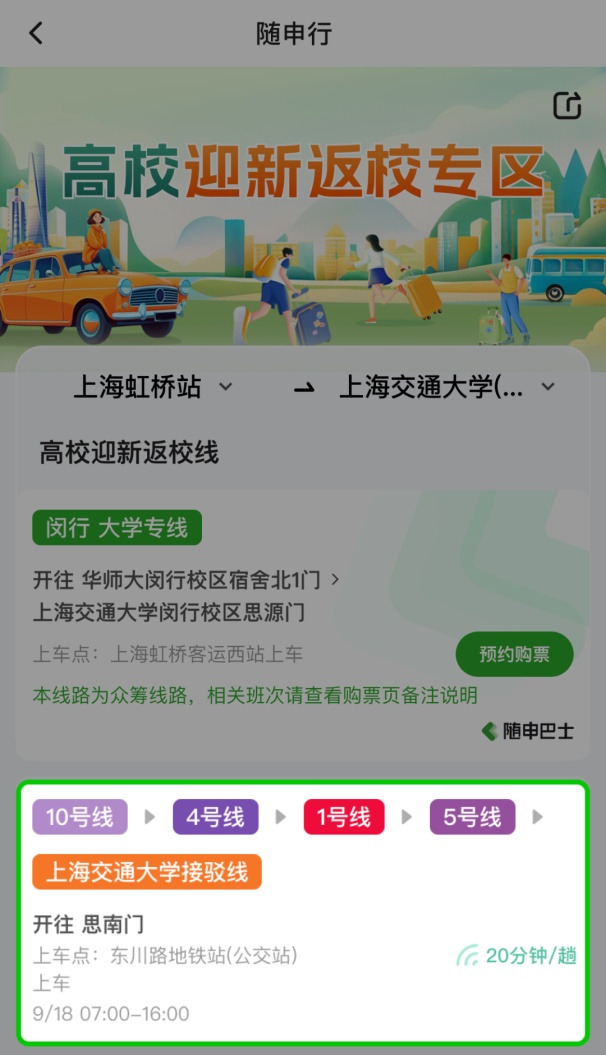 2.2024级的新生们,如果你的学校提供迎新接驳线,可同时在“高校迎新返校专区”的出行推荐方式下找到该接驳线信息,并根据发车时间及上车点安排行程。